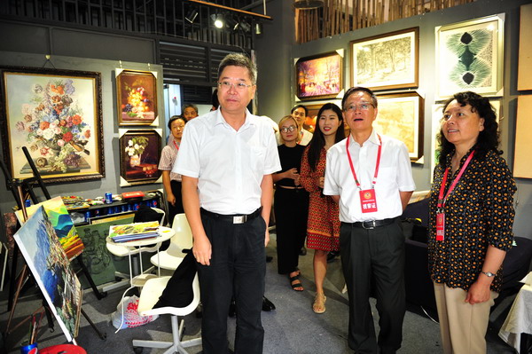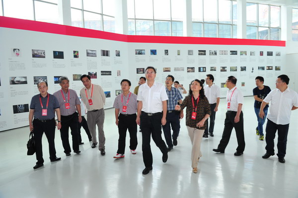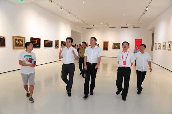 参观完我校大学生文化创意微型企业园之后,视察团一行在黄政、左益陪同下,还参观了我校新校区美术馆以及正在美术馆展出的展览。