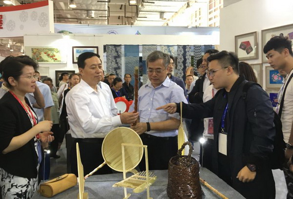 文化部副部长项兆伦、文化部非遗司司长马盛德及山东省相关领导在我校展台前驻足良久,详细了解我校参加本次展览的相关作品,并给予了高度评价。我校竹编培训班丁鹏程等学员创作的梁平竹帘系列创意作品引起了广泛的好评,我校展览负责人员为项兆伦副部长一行介绍了这组作品的制作过程和工艺特点,从一根完整的竹子,到篾成竹丝并与蚕丝织接形成竹帘,最终形成竹帘扇、竹帘首饰盒、竹帘灯罩以及挎包等一系列不同于传统竹帘制品的创意产品。由綦江学员黄昭发等人制作的檬子木烟斗、拐杖等作品也得到大家的关注和喜爱,文化部领导一边听取关于檬子木的生长环境、习性的讲解,一边亲自体验产品的功能和用途。