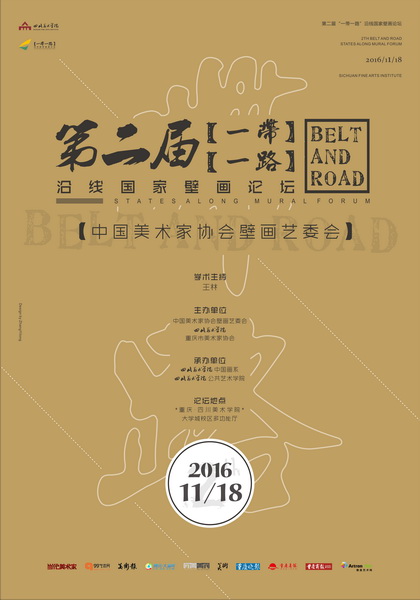 由中国美术家协会壁画艺委会、四川美术学院、重庆市美术家协会共同主办,四川美术学院中国画系、公共艺术学院承办的第二届“一带一路”沿线国家壁画论坛,将于2016年11月18日在四川美术学院大学城校区多功能厅举行。此次论坛共有来自中国美协、壁画艺委会、中国壁画学会、中国13所高等艺术院校和国外院校、美术馆以及敦煌研究院、龟兹研究院、永乐宫壁画艺术博物馆、陕西历史博物馆等研究机构和《美术》、《画刊》、《当代美术家》等专业媒体的专家学者参加。