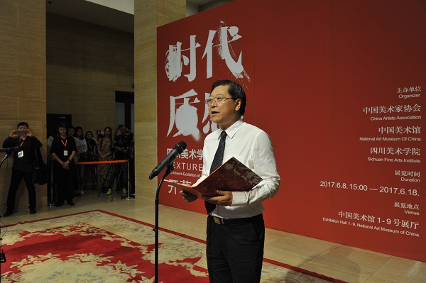 “时代质感——四川美术学院作品展”于2017年6月8日下午在中国美术馆隆重开幕。此次展览由中国美术家协会、中国美术馆、四川美术学院共同举办。四川美术院长庞茂琨代表学校致辞,中国美术馆馆长、中国美协副主席吴为山,全国著名美术批评家代表、资深老专家邵大箴,中国美术家协会分党组书记、常务副主席、秘书长徐里,中国文联副主席、中国美协副主席、中国美术学院院长许江等分别致辞讲话。全国政协常委、原中央美术学院院长靳尚谊宣布展览开幕。开幕式由四川美术学院党委书记黄政主持。