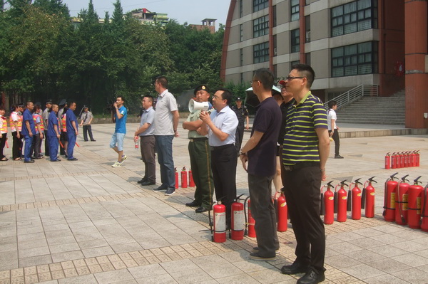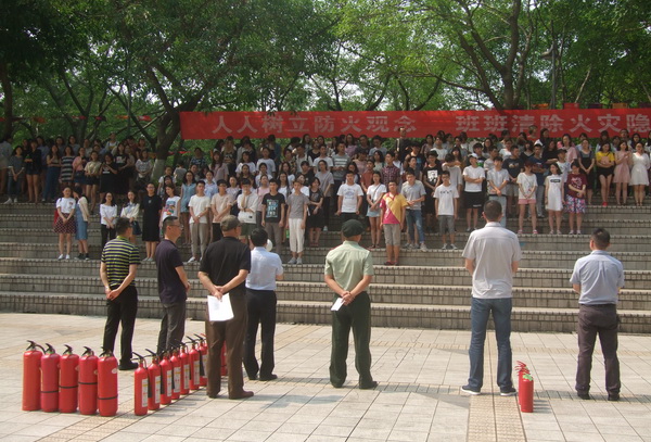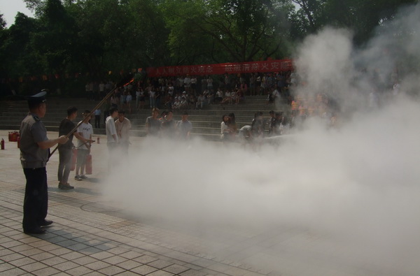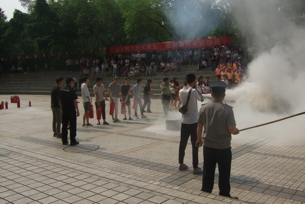 随后,九龙坡区消防支队张参谋讲解了报警流程、自救互救、逃生知识和灭火器的使用方法,使学生开阔眼界,增长了消防知识;公共艺术学院教职工、学生和物业管理人员进行灭火器实际操作演练;最后微型消防站队员进行了链接水带枪头喷水灭火演练。