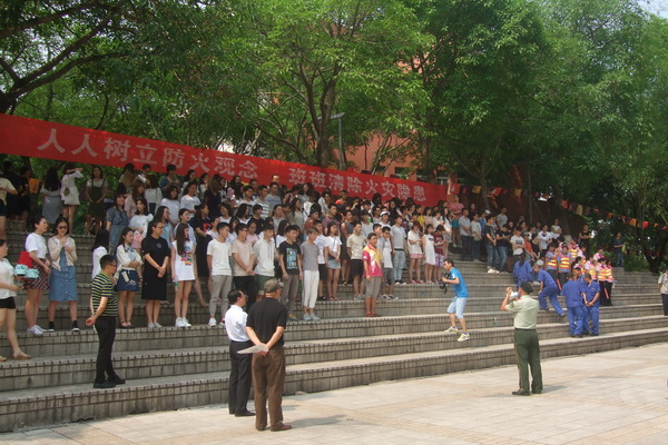 当天下午3点,演练总指挥彭林权宣布活动开始,伴随着火灾警钟长鸣,绘画楼和美教楼的学生迅速安全有序地撤离至综合楼广场台阶上。