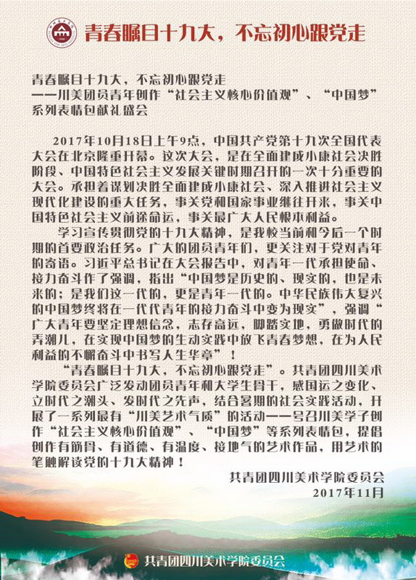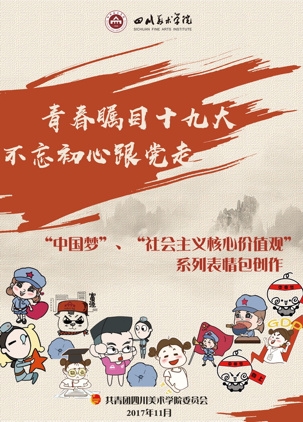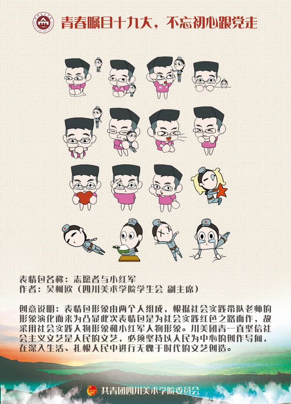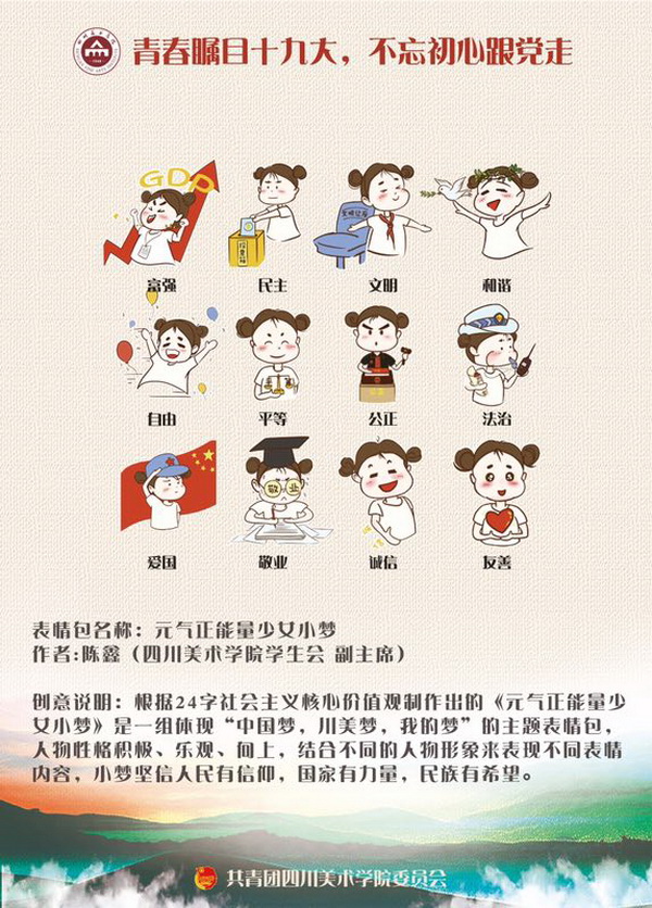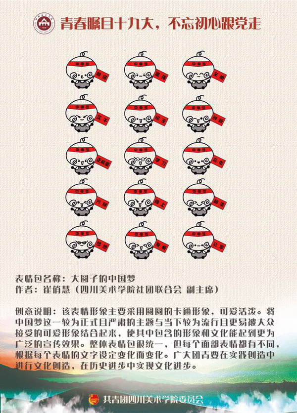 由团委组织的团员青年创作的十九大精神表情包,将“社会主义核心价值观”、“中国梦”等主题,用青年们喜闻乐见的动漫形象,生动的展现出来。“志愿者与小红军”、“元气正能量少女小梦”、“大圆子的中国梦”、“红色小熊”等创意作品,以生动形象的造型,妙趣横生的表情包,反映出当代青年坚定理想信念,志存高远,脚踏实地,勇做时代弄潮儿,在实现中国梦的生动实践中放飞青春梦想,在为人民利益的不懈奋斗中书写人生华章。