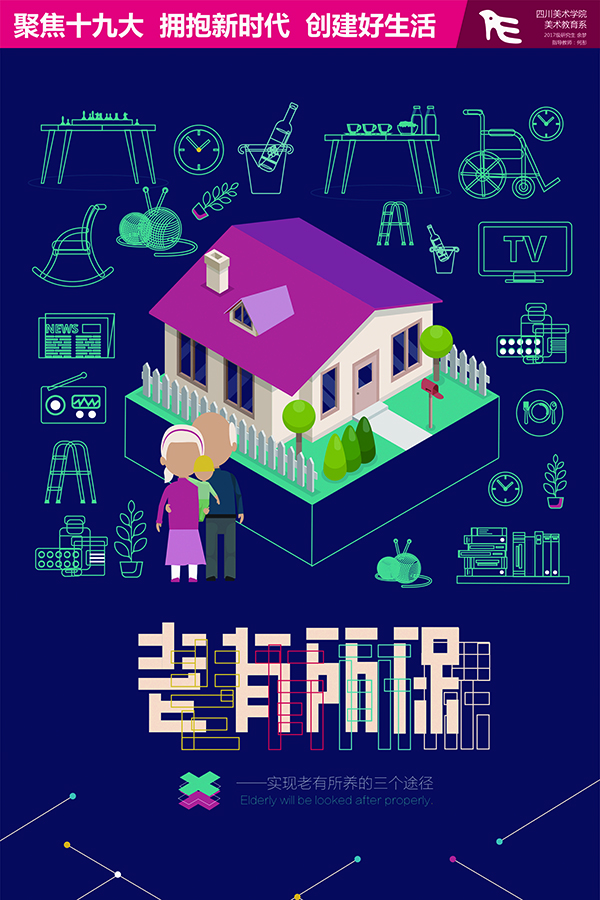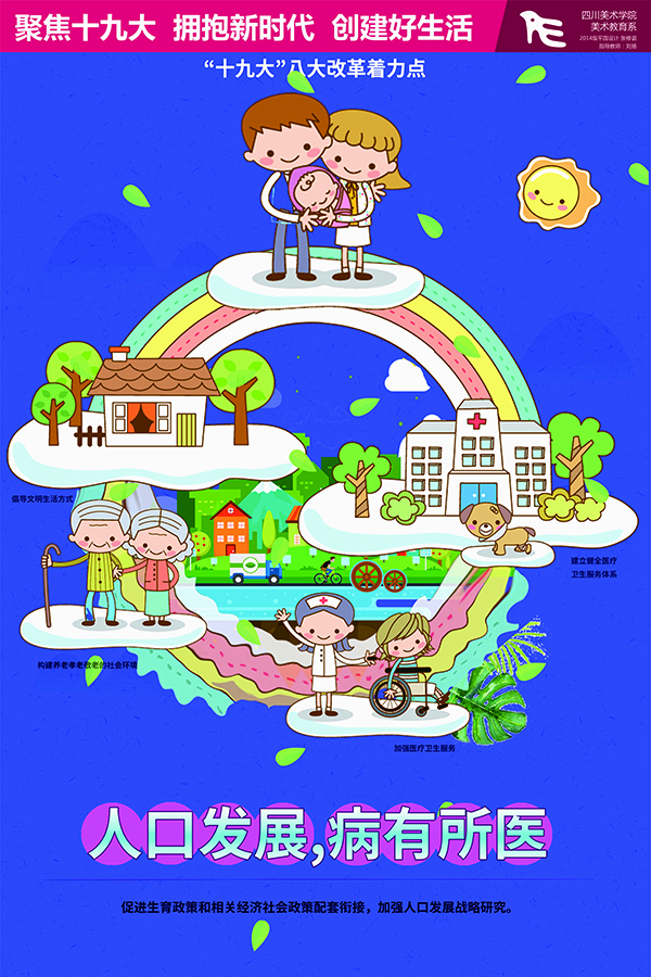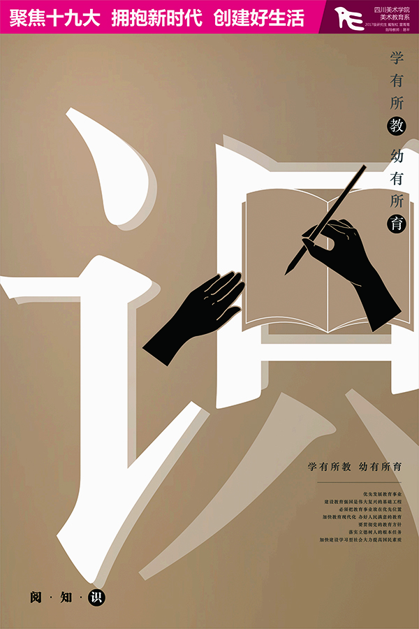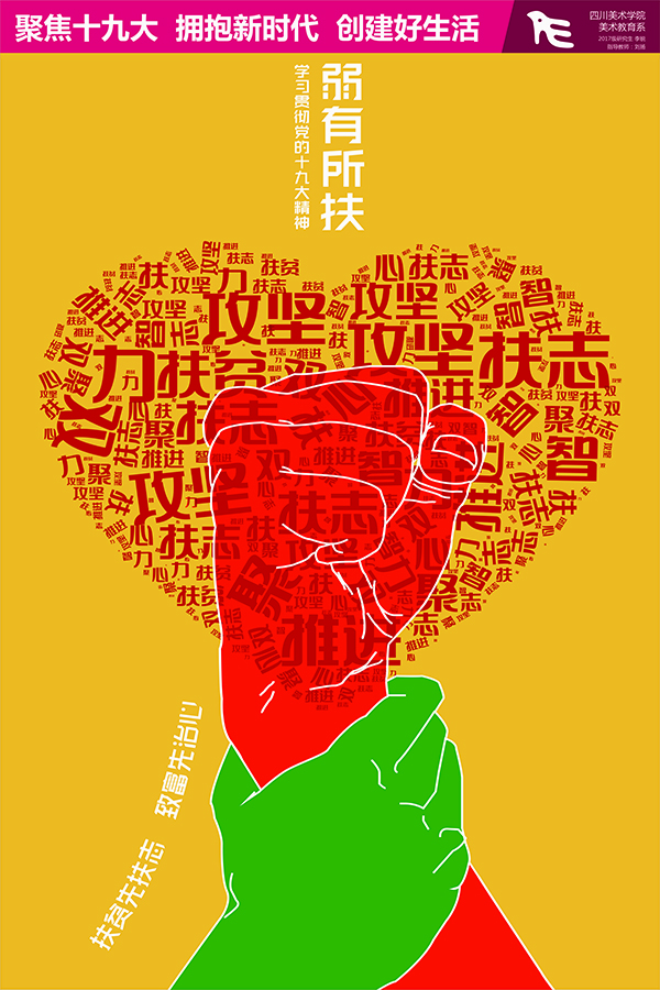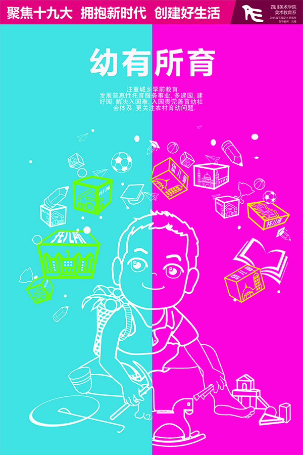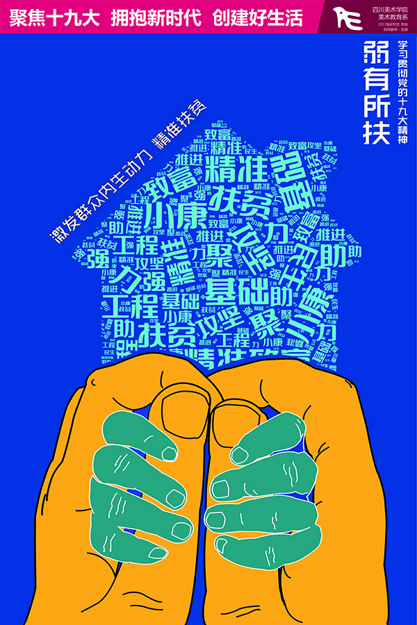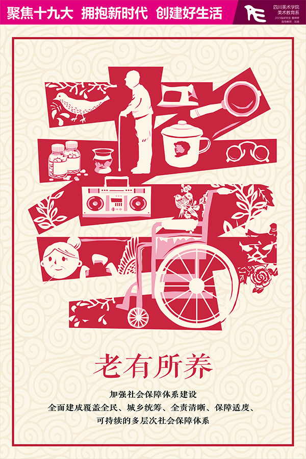 “人民对美好生活的向往,就是党的奋斗目标。”党的十九大报告提出,要坚持在发展中保障和改善民生。美术教育系师生围绕“幼有所育、学有所教、劳有所得、病有所医、住有所居、弱有所扶”等民生内容,创作了系列主题招贴。刘洋等老师从对十九大精神的解读,到内容主题的确立,到设计语言的选择,到画面内容的构成,对同学们进行了悉心的指导,共创作出系列作品50余幅。