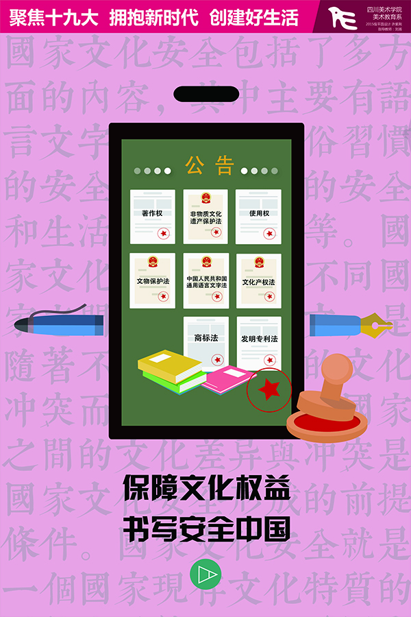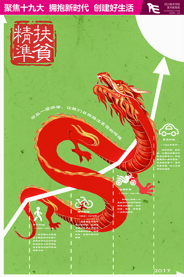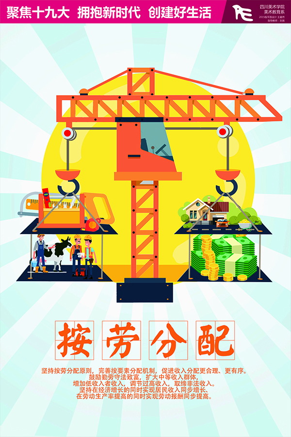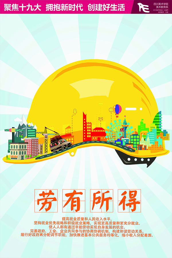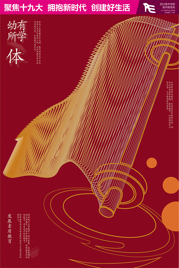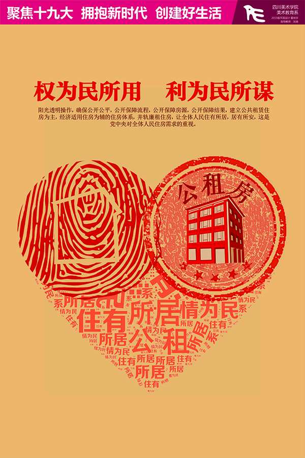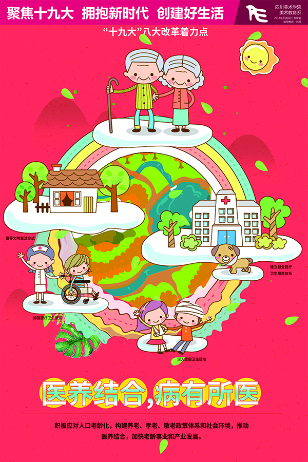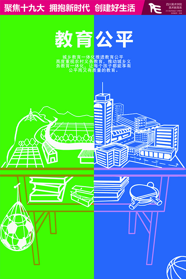 “人民对美好生活的向往,就是党的奋斗目标。”党的十九大报告提出,要坚持在发展中保障和改善民生。美术教育系师生围绕“幼有所育、学有所教、劳有所得、病有所医、住有所居、弱有所扶”等民生内容,创作了系列主题招贴。刘洋等老师从对十九大精神的解读,到内容主题的确立,到设计语言的选择,到画面内容的构成,对同学们进行了悉心的指导,共创作出系列作品50余幅。