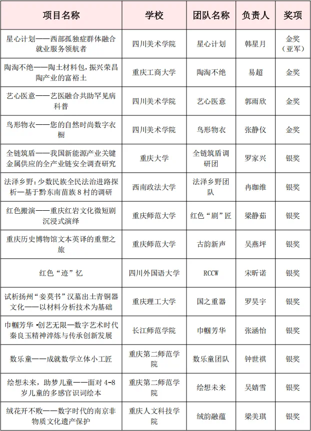 12月20日至22日,2024年大学生新文科实践创新大赛决赛在山东济南举行。重庆市代表队在比赛中斩获佳绩,共获得金奖4项、银奖13项、铜奖34项、优秀奖41项,其中四川美术学院1个金奖项目获全国亚军,重庆市教育委员会荣获优秀组织单位奖。重庆市委教育工委委员、市教委副主任蒋云芳出席颁奖典礼并作为省级教育行政部门唯一代表介绍重庆文科类学科竞赛及本次大赛的经验做法。