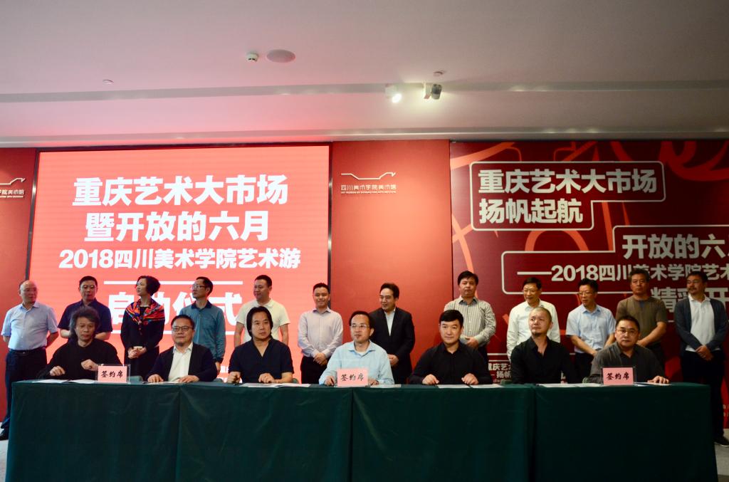 仪式上,我校黄山、傅舟、黄越、王朝刚、赵青、申晓南等6位艺术家教师代表和李琪、李林曼、范凤珊、黄东仪、吴思韵、吕杰、赖楠、戴术、牛黎明、彭阳、郭安宁、李祯彦等12位优秀毕业生代表,与重庆艺术大市场的运营单位重庆文化产权交易中心签署了入驻合作协议。