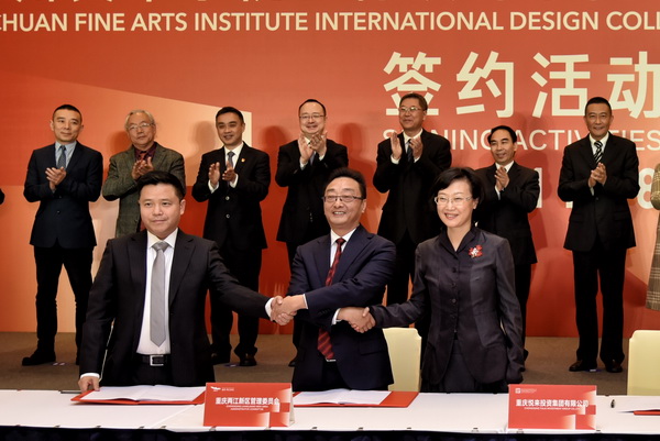 签约仪式上,我校庞茂琨校长与两江新区秦淑斌、悦来投资集团王菊梦共同签署了四川美术学院国际设计学院(中国西部艺术港)项目合作协议。邓睿、罗勇、黄政、陈方兰、石键、左益、陈林、张杰、侯宝川、苟欣文、焦兴涛上台共同见证了这一重要时刻。