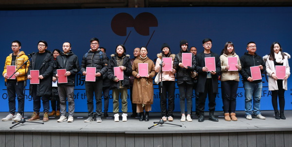 开幕式上,首先进行了年展优秀作品颁奖。彭林权分别宣读了第15届研究生作品年展、第22届学生作品年展获奖作品名单。本届研究生作品年展入选作品共235件,论文19篇。经过院系初评、学校复评,最后遴选出44件作品、4篇论文获得优秀奖。学生作品年展共入选407件,经过院系推荐,学校专家组评审,78件作品获优秀奖,其中,美术学类作品28件,艺术设计类作品29件,影视动画类作品14件,优秀论文7篇。主席台领导为获奖学生代表颁奖。
