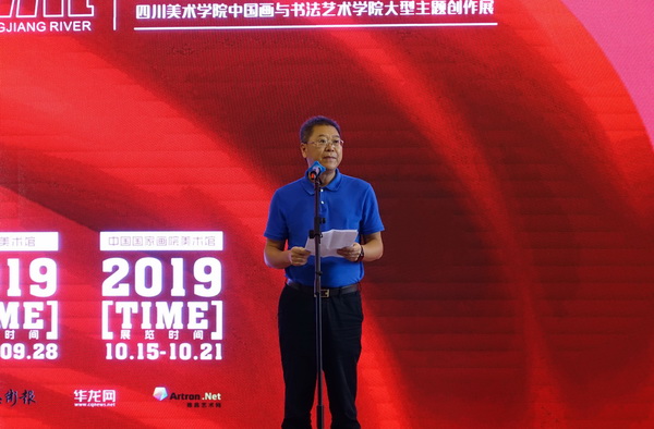 邓建强在致辞中说:“礼赞新时代,讴歌母亲河”的创作主题也是积极响应“深入生活,扎根人民”的号召,以及坚持立足本土、打造精品、服务社会的理念,通过组织此次大型主题创作,并通过“走出去”积极对外交流的模式,打造重庆优势品牌项目,搭建与其他省市的沟通桥梁,在和谐、共赢、开拓的氛围中让重庆中国画创作者走向全国的大舞台,也希望重庆的中国画创作者以更加精彩的作品,反映长江流域日新月异的风貌,用丰硕的艺术成果来回报社会,回报人民!