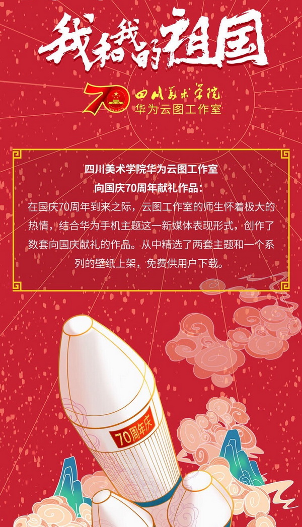 在国庆70周年到来之际,华为软件技术有限公司和四川美术学院设计学院联合的川美华为云图工作室正式发布为新中国成立70周年献礼的手机主题。设计学院师生和开发人员紧密协作,结合华为手机主题这一新媒体表现形式,创作了数套向国庆献礼的作品,并从中精选了两套主题和一个系列的壁纸上架,免费供用户下载。