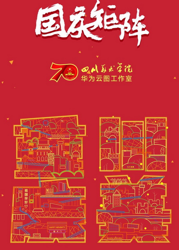 主题二:国庆矩阵。这套主题以“重庆、川美”为题,使用丰富的线条层叠,勾勒出重庆浓厚的地域文化与四川美术学院的人文传统,城市与校园,现在与未来,彩光四溢,五星闪闪,表达了重庆人民和川美师生对祖国70年庆典的热切盼望和饱满热情。