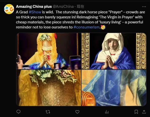 ——网络反响热烈。全网相关话题讨论量超过10亿人次。互联网信息共386450条,其中,视频117386条,微博111501条,客户端81580条,微信47213,网站25901条,论坛204条,数字报265篇。“川美毕业展”相关话题登上小红书、微博、百度、网易等热搜榜单,如话题“川美毕业展爆火作品是我画的”6月8日曾登顶小红书热搜第1名,话题“川美毕业展”最高排名为微博全国排名第8位,话题“川美爆火毕业作品《祷》已售出”于6月10日登上百度热榜。从舆情属性看,正面和中性信息占比为93.29%,舆论环境正面。