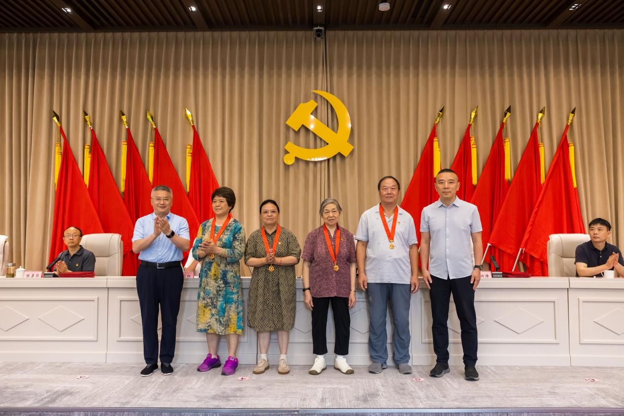 唐青阳、焦兴涛为曾凡英、冷永琼、郭爱玉、柯常轩等四位老党员颁发“光荣在党50年”纪念章。