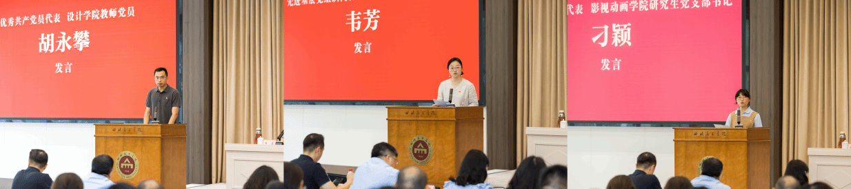 段胜峰宣读了《中共四川美术学院委员会关于表彰优秀共产党员、优秀党务工作者和先进基层党组织的决定》。校领导为受表彰的优秀个人和先进集体颁发了荣誉证书和奖牌。“两优一先”代表韦芳、刁颖、胡永攀三位同志在会上分别做了交流发言。