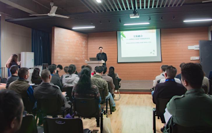开班仪式后,王发荣以《在文旅融合背景下推动非物质文化遗产创造性转化创新性发展》为题,进行了开班授课。他以文旅融合的时代背景,对非物质文化遗产进行了介绍和解释。他希望非遗传承人们以开放的心态与政府力量、商业力量进行合作,共同打造非遗新未来。