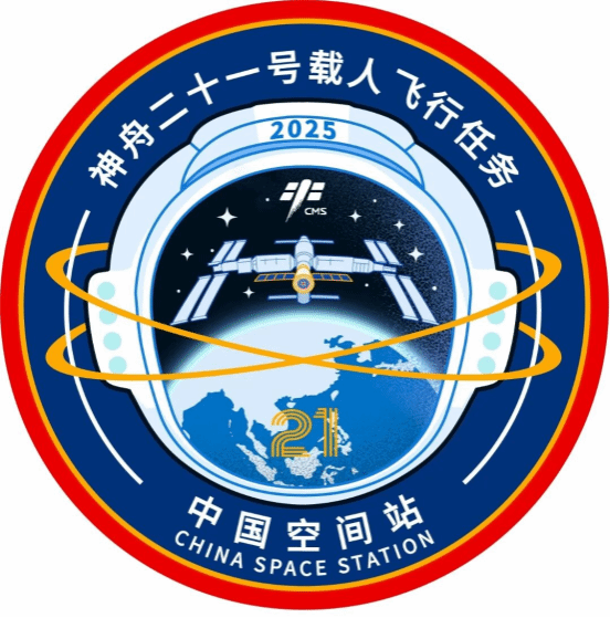 神舟二十一号载人飞行任务标识整体以航天员头盔元素作为设计主体,传递出中国航天事业事在人为,探索永不止步的理念。