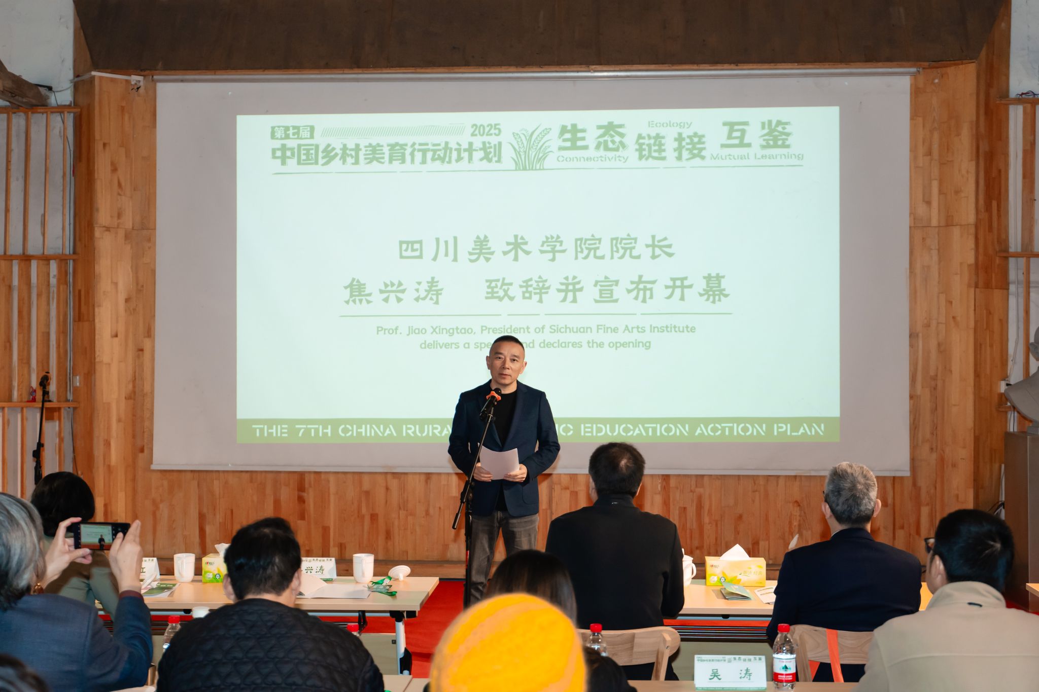 四川美术学院院长焦兴涛在开幕式上致辞并宣布开幕。他指出,乡村美育不仅关乎审美的启迪,更关乎民族精神的滋养与文化自信的塑造。“生态·链接·互鉴”既是当下美育的时代议题,也是未来乡村文化发展的方向召唤。学校将以艺术理论与美育实践相结合,落实国家《文艺赋美乡村工作方案》,搭建国家战略与地方创新之间的桥梁,推动文艺赋美、教育赋智、文化赋能。
