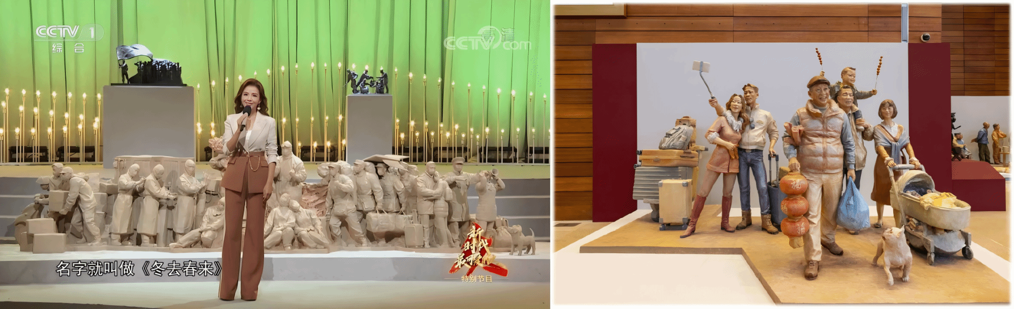 (雕塑《冬去春来》、“百年巨变——雕塑作品展”之“幸福奔小康”拼图)