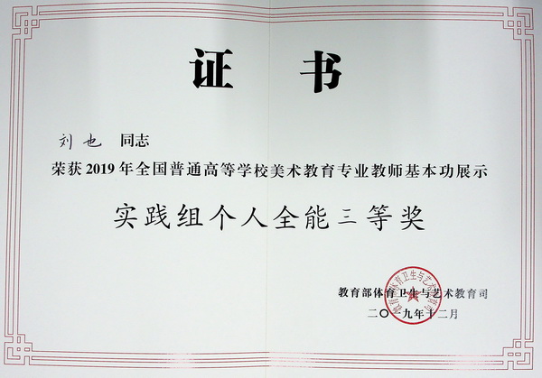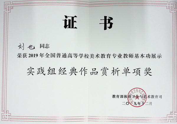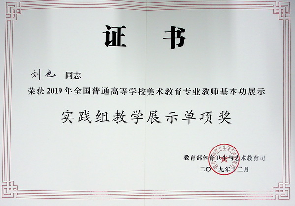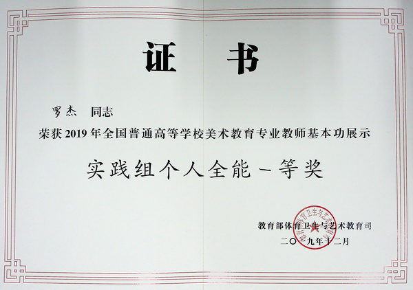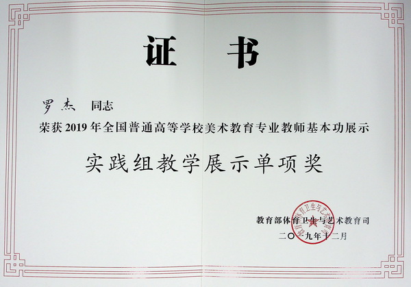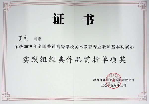 在日前结束的2019年全国普通高等学校美术教育专业教师基本功展示中,我校青年教师罗杰、刘也取得优异成绩。其中,罗杰获得实践组个人全能一等奖,刘也获得实践组个人全能三等奖,两位教师还同时获得实践组教学展示单项奖和经典作品赏析单项奖,全面展现了新时代川美教师优秀的综合素质、专业水平和创新实践能力。