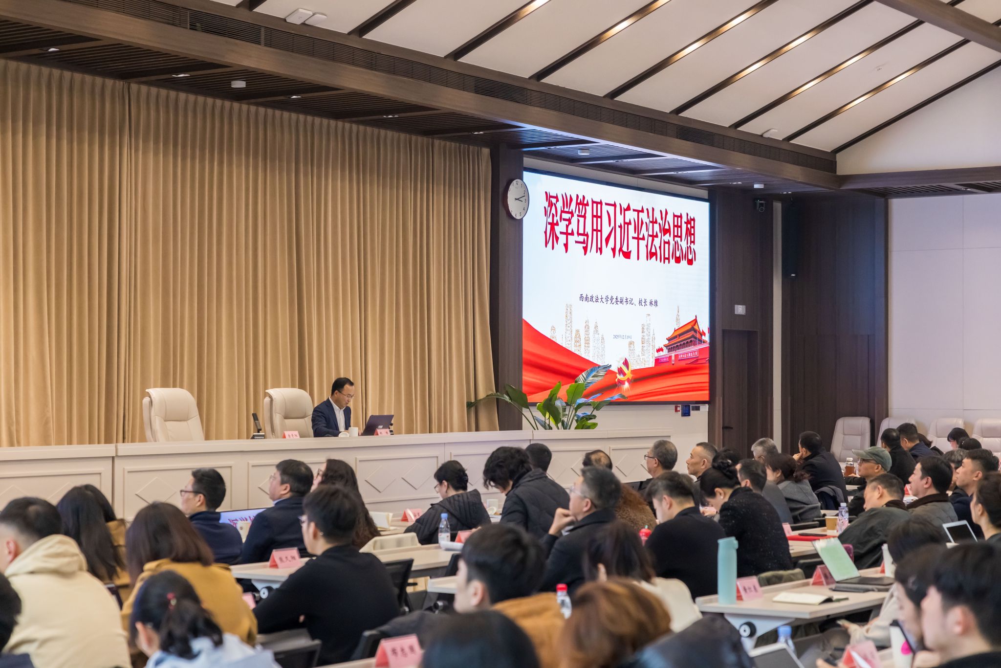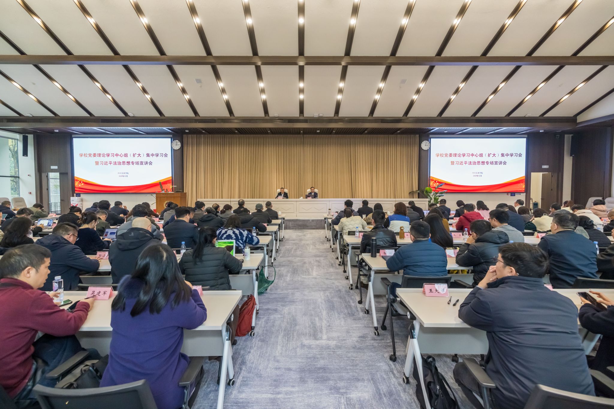 为深入学习宣传党的二十届四中全会精神,深入学习贯彻习近平法治思想,筑牢法治思想根基,进一步增强我校党员干部和广大师生的法治意识、法治观念,全面推进依法治校。12月19日下午,我校举行党委理论学习中心组扩大集中学习会暨习近平法治思想专场宣讲会,邀请西南政法大学党委副书记、校长林维教授来校宣讲。学校党委书记唐青阳主持宣讲会,在家校领导出席会议,科级以上领导干部、基层党支部书记、辅导员参会。