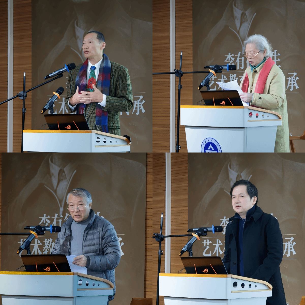 李兆庆分享了如何运用新技术对老一辈艺术家的成就进行传播与活化。李有行先生的学生代表钟茂兰、陈恩深、王新福等教授深情回忆了受教于先生的难忘岁月,生动讲述了其注重实践、因材施教的教学风范。清华大学美术学院郭秋惠教授从设计职业与美化人生的艺术史视野阐述了李有行先生设计教育的双重维度。四川大学赵帅副教授、设计教育史研究专家瞿孜文副教授分别从李有行美育思想研究、早期艺术活动考证等角度发表了学术见解。我校尹丹教授作为展览策展人,系统梳理了李有行先生依托北平艺专人脉所建构的学校教学体系;吕曦教授则结合当下学科发展阐述了先生教育思想的当代启示。十余位发言者从不同维度,共同勾勒出李有行先生艺术教育思想的完整图景与不朽精神。