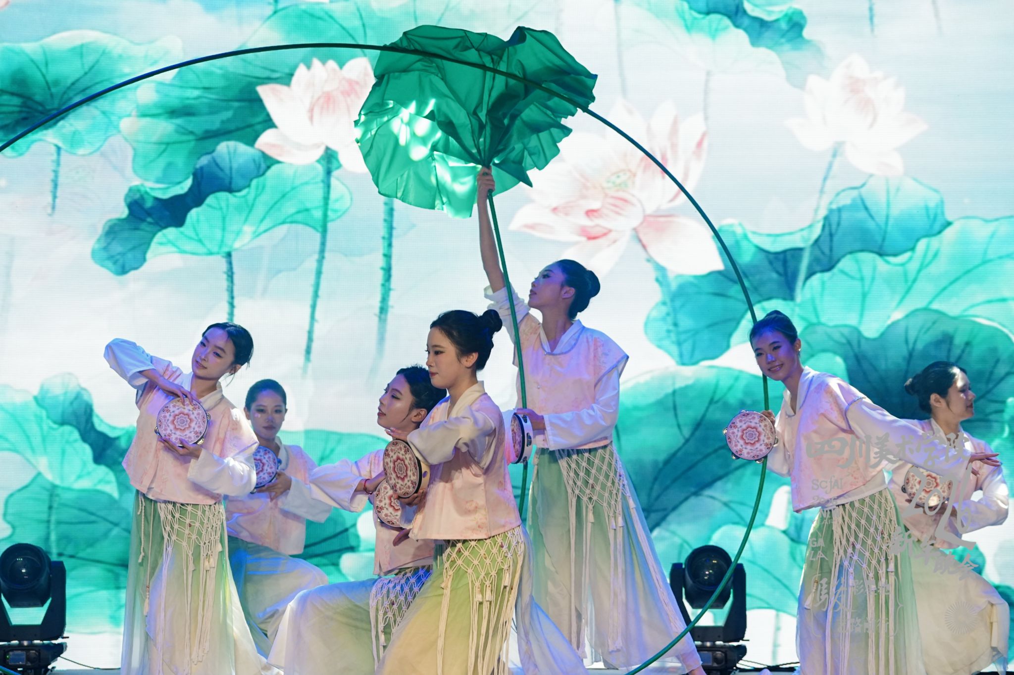 从千年文脉的赓续传承到中外艺术的碰撞交融,时代的色彩,在多元表达中愈发斑斓。在第一篇章时代斑斓中,大学生艺术团舞蹈《天浴·开路》以圣洁哈达礼赞民族深情;公共艺术学院《莲鼓越歌行》勾勒江南采莲的诗意画卷;《迈步永恒 Forever MJ》则借经典舞步架起中外文化交流的桥梁。