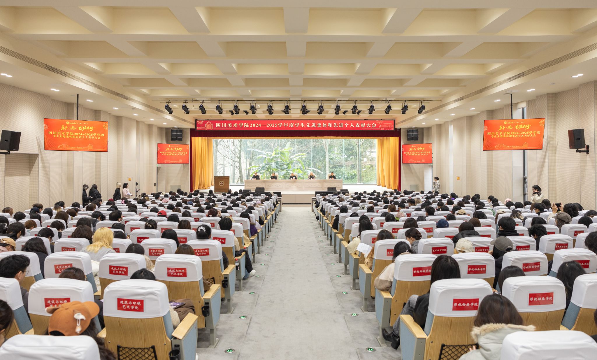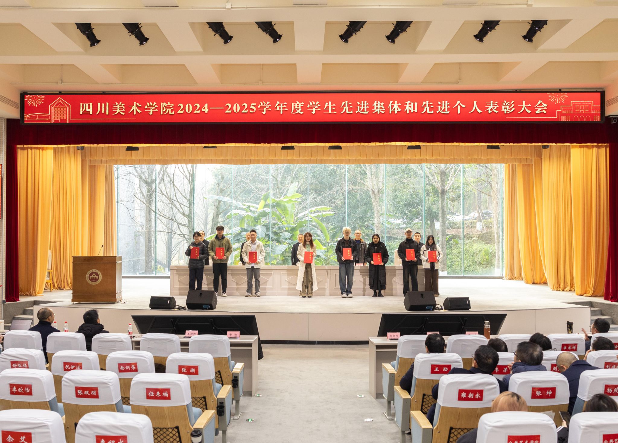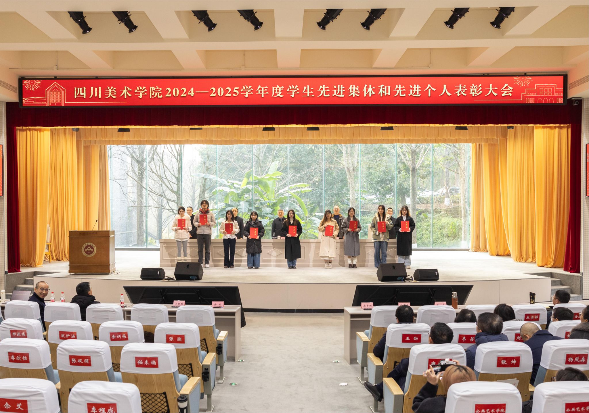 黄云宣读《四川美术学院关于表彰2024—2025学年度学生先进集体和个人的决定》,校领导为获得表彰的先进集体和先进个人代表颁奖。