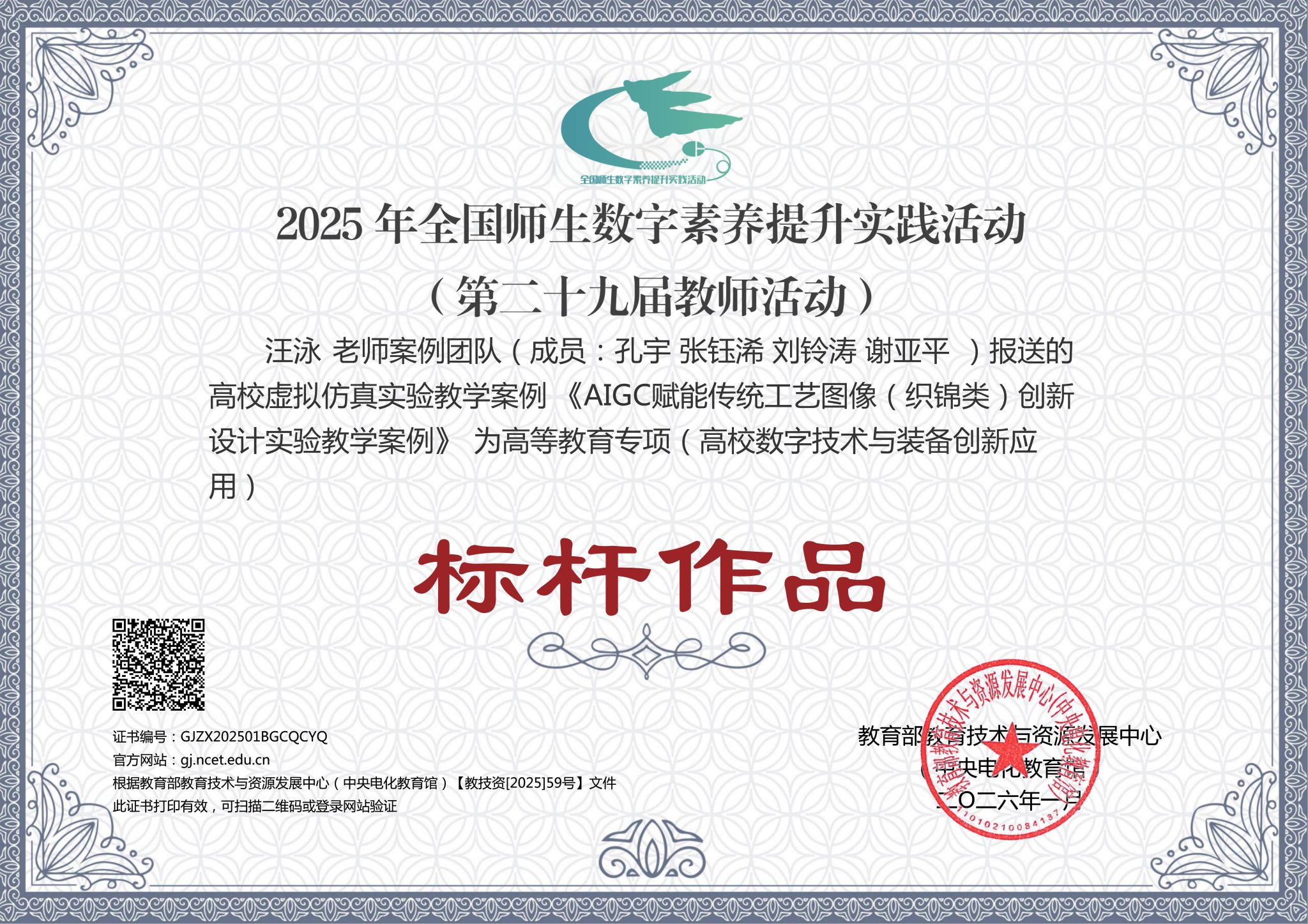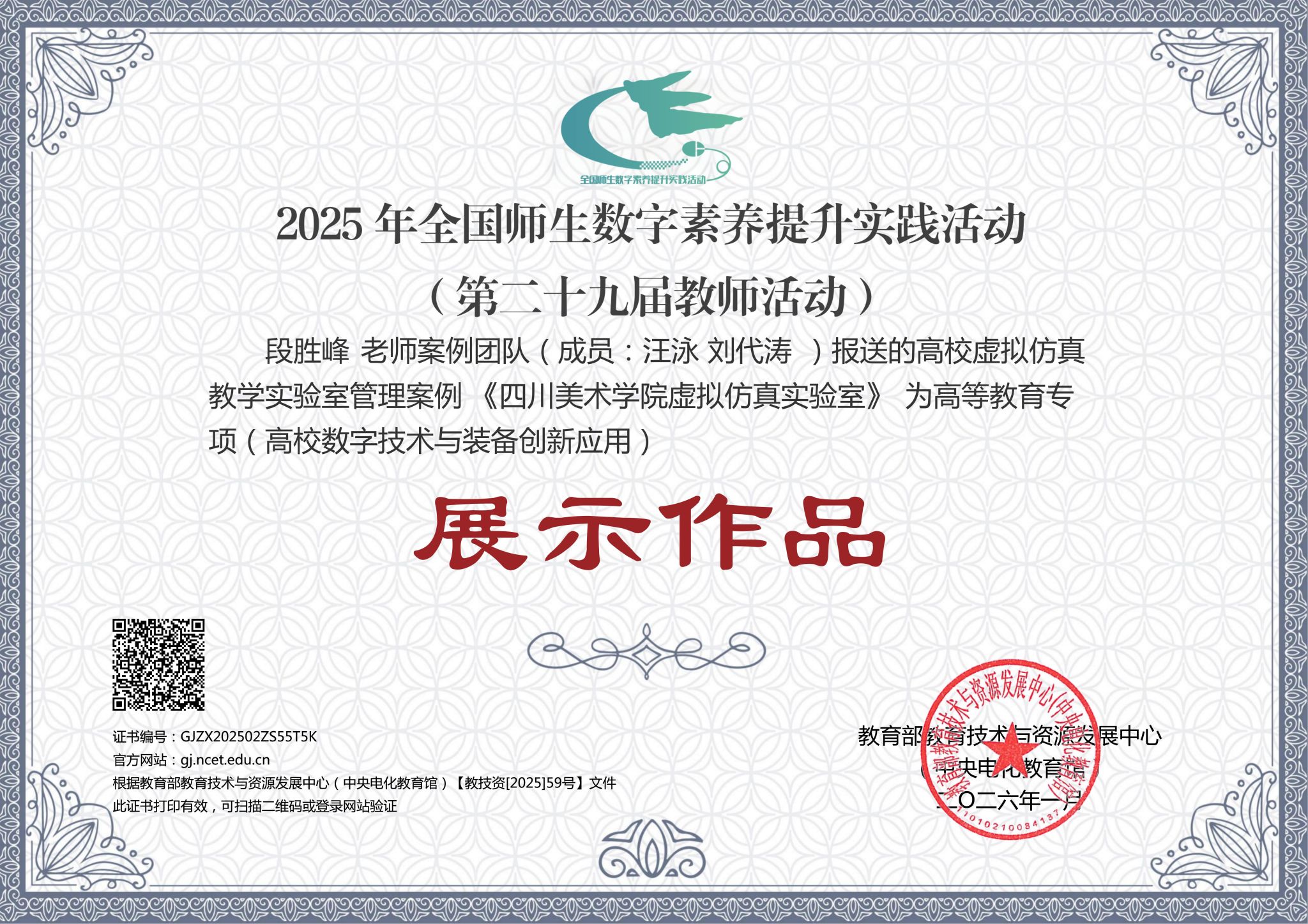 近日,教育部教育技术与资源发展中心(中央电化教育馆)《关于总结2025年全国师生数字素养提升实践活动(第二十九届教师活动)参与情况的通知》公布,我校实验教学中心两项虚拟仿真实验教学项目入选。其中,《AIGC赋能传统工艺图像(织锦类)创新设计实验教学案例》入选标杆作品,《四川美术学院虚拟仿真实验室》入选展示作品。
