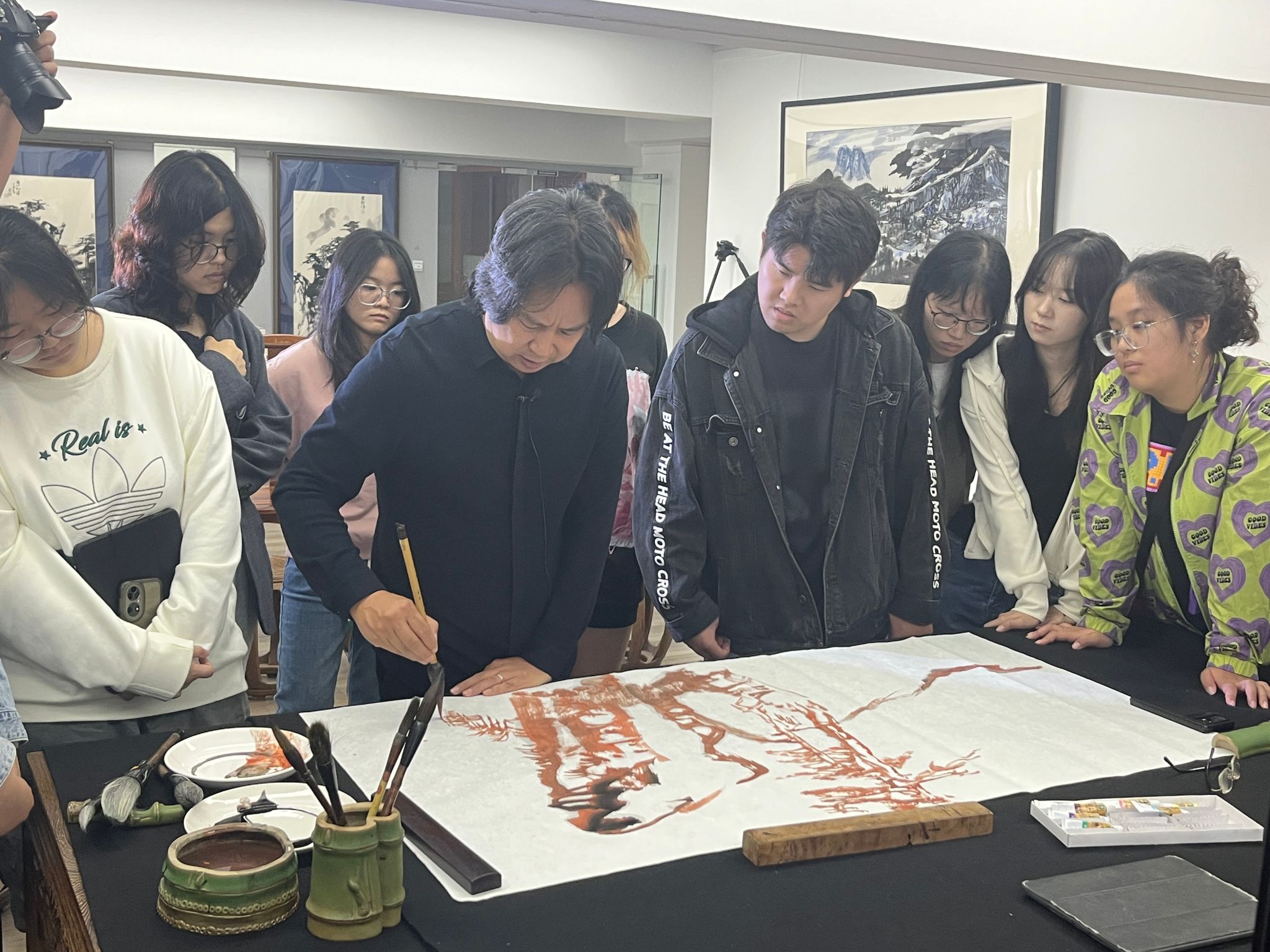 《山水画创作》课程教学内容为写意山水画创作。采用理论讲授、课堂示范、互动交流等方式,按照“传承·转化·创构”三个阶段开展教学。课程以“思政+艺术”的教学理念为导向,聚焦“美丽乡村”“红岩文化”“长江文化”“巴蜀文化”等主题,鼓励创作为祖国山河立传、反映时代气象的创新性山水画作品。以创作带动教学,推进“项目制”教学模式改革,采用“导师组+班级”模式,将传统的“(1教师)+(N学生)”教学模式转变为“(1+N教师)+(N学生)”的团队互动型教学模式,让学生能够转益多师,个性得到发展。构建“过程+作业+成果”三维课程评价体系,使教学过程和成果得到全面而充分地评价。开展“黄原书画奖学金”“学生作品年展”等多项专业展评活动,全面激发学生创新能动性。