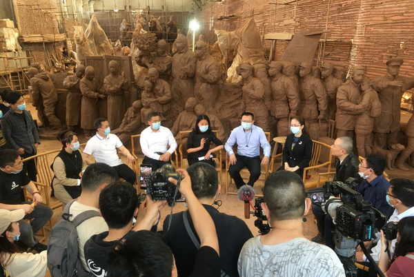 把课堂设在雕塑现场,把讲授放在网上。作为课程思政的重要内容,本次媒体见面会全程作为我校造型艺术学院雕塑系的在线直播课堂,同步进行了课堂教学直播。焦兴涛副校长说到:“在新冠疫情发生之后,我们让这些生动的人物、鲜活的场景和感人的事迹,成为川美教学和创作的素材,不断提升学生把握大场景的专业创作能力,也带给学生思想上的洗礼。”