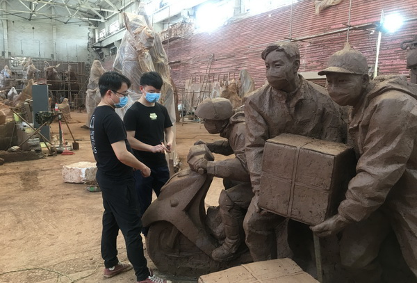 雕塑系的教学团队,从本次主题创作方案的提出、修改、泥塑、捶打、塑形,人物刻画,样样不落,亲力亲为,常常戴着口罩,在重庆只有10度左右的气温下大汗淋漓,湿透衣衫。学生看在眼里,感动在心里。“老师们以身作则,遇事则教让我深受感动。在疫情中学习雕塑由于时间和材料方面有诸多不便,有时会感到迷茫无助。但敬爱的老师为我们上了很好的一堂专业课,用实际行动让我体会到艺术学习离不开对生活切实感受的思考,更不能置身于社会现实之外,我们应该担当起更多时代赋予这一代人的责任。作为川美雕塑系的学生是幸福的。”雕塑系学生赵强如是说。