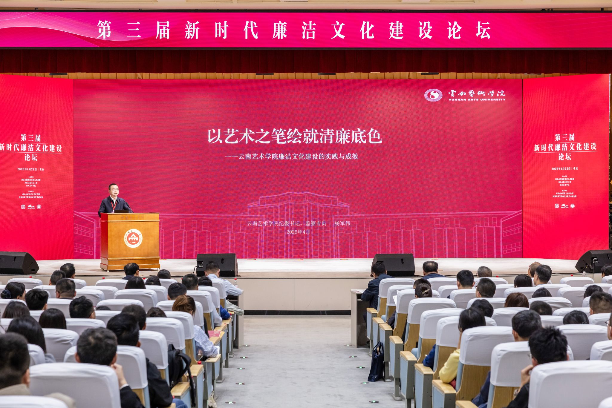 西部高校廉洁文化艺术联盟高校代表——云南艺术学院纪委书记、监察专员杨军伟作《以艺术之笔绘就清廉底色——云南艺术学院廉洁文化建设的实践与成效》报告。他从党建引领筑牢廉洁文化建设“压舱石”,艺术赋能打造廉洁文化传播“新载体”,思政融合构建廉洁文化教育“大课堂”,文化浸润涵养风清气正“育人场”四个方面总结了云南艺术学院廉洁文化建设的实践成果。