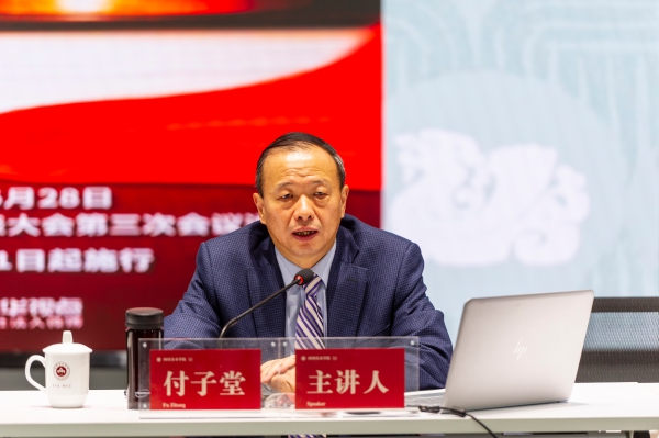 在两个小时的报告中,付子堂校长从中国特色社会主义法律体系、民法的基本内涵及历史沿革、民法典的基本框架及主要内容、民法典的重大历史及现实意义等四个方面展开宣讲,对《民法典》编纂的历程、时代背景和历史沿革进行了回顾,并就《民法典》的主要内容和重要影响进行了全面深入解读。他以深厚的理论素养、宽阔的研究视野融会贯通的宣讲,有效帮助学校干部和师生深刻领会、全面把握《民法典》的丰富内涵和重要影响。付子堂指出,《民法典》是以习近平同志为核心的党中央在新时代全面推进依法治国的伟大征程中领导法治建设所取得的伟大成果,是社会生活的“百科全书”,是实现“两个一百年”奋斗目标、实现中华民族伟大复兴的最根本保障。认识领会新中国第一部民法典的精神,充分发挥民法典在推进国家治理体系和治理能力现代化中的作用,切实推动《民法典》全面有效实施,广大党员干部和师生员工义不容辞。