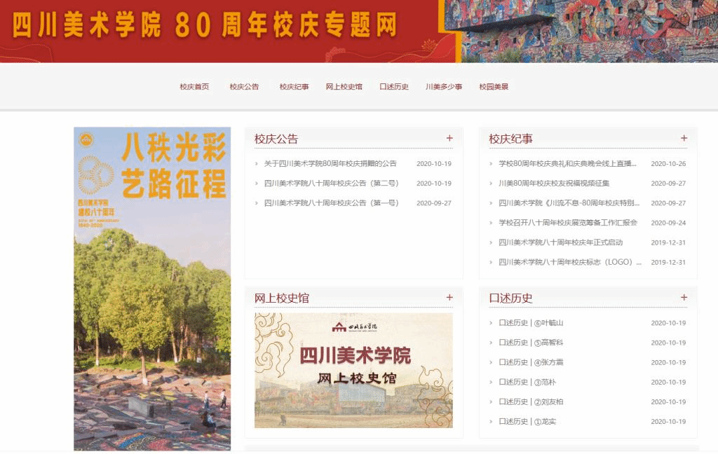 值四川美术学院庆祝建校80周年之际,在校史馆一期建设的基础上,为全面展现学校建校80年来的辉煌成就,加强师生的校史教育,增强师生的爱校荣校意识,学校党委宣传部提前筹划,经过为期一个月的进一步修订完善和设计排版制作,终于在2020年10月28日校庆日当天,正式推出四川美术学院网上校史馆和掌上校史馆,方便全校师生、广大校友和社会各界不用走进校史馆,通过电脑、手机就可以了解到川美八十年的丰厚历史与办学成就。