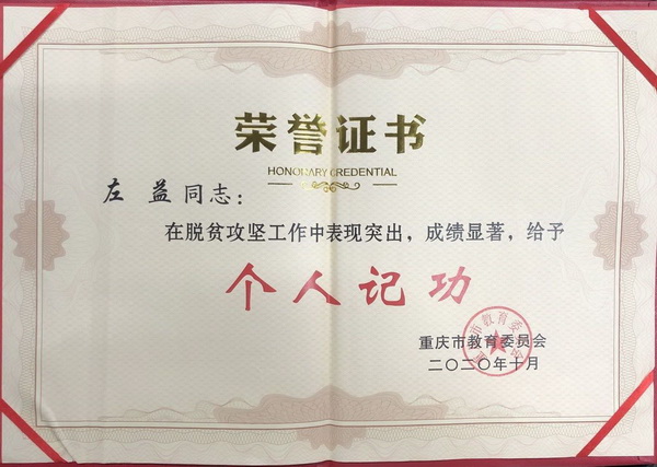 2020年,我校在脱贫攻坚工作表现突出,成绩显著,近日,重庆市教育委员会给予我校集体嘉奖;给予我校党委副书记左益“个人记功”。
