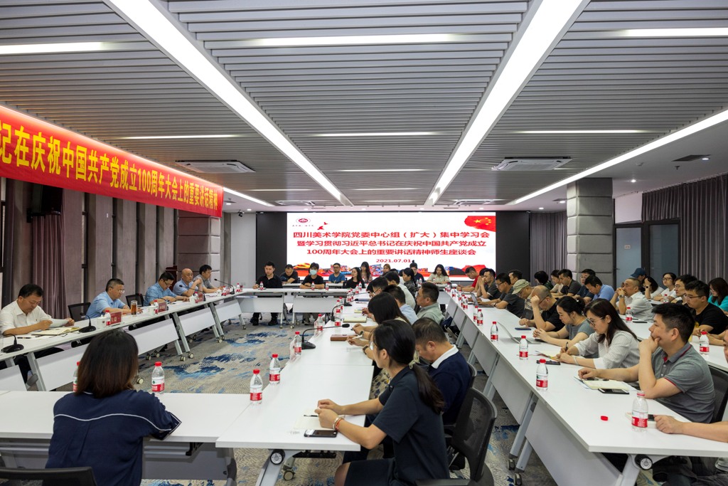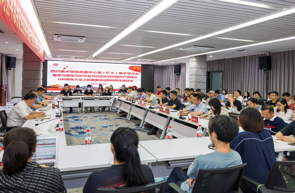 7月1日下午,在认真组织收听收看了庆祝中国共产党成立100周年大会后,我校党委第一时间举行党委理论学习中心组扩大集中学习,组织师生专题学习研讨习近平总书记在庆祝中国共产党成立100周年大会的重要讲话精神。会议主要任务是深入学习贯彻总书记在庆祝大会上的重要讲话精神,进一步统一思想、凝聚共识、激励干劲,为推动学校教育事业发展,建设“国内一流、国际知名”的高水平美术学院凝心聚力。