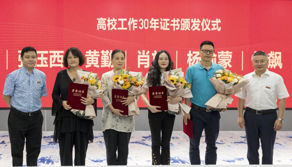 会议首先举行在高校工作满30年教职工的表彰仪式。学生代表为老师们献花,党委书记唐青阳、校长庞茂琨为高校工作满30年教职工代表颁发荣誉证书。随后,学校保卫处处长黄勤作为在高校工作满30年教职工代表,分享了其参与见证学校建设发展的感悟,以及坚守责任和担当为学校发展而艰苦奋斗的决心。