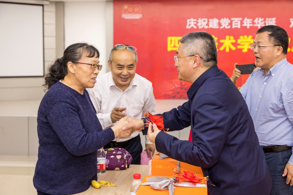 老寿星代表、学校老领导罗力发言。他代表全体老同志对学校党委行政对老同志的关心关爱表示感谢。“霞披夕阳情无限,霜染秋风叶正红”,希望全体老同志老有所学、老有所乐,老有所为,关注学校改革发展,支持理解学校工作,为建设一流高等美术院校贡献智慧和力量。学校老领导李自仲为大会赋诗一首,表达了全体老同志对庆祝建党100周年的礼赞和祝福,也表达了对学校美好未来的期许与向往。最后,校领导和全体老寿星合影留念,真诚祝愿老同志健康长寿,晚年幸福。