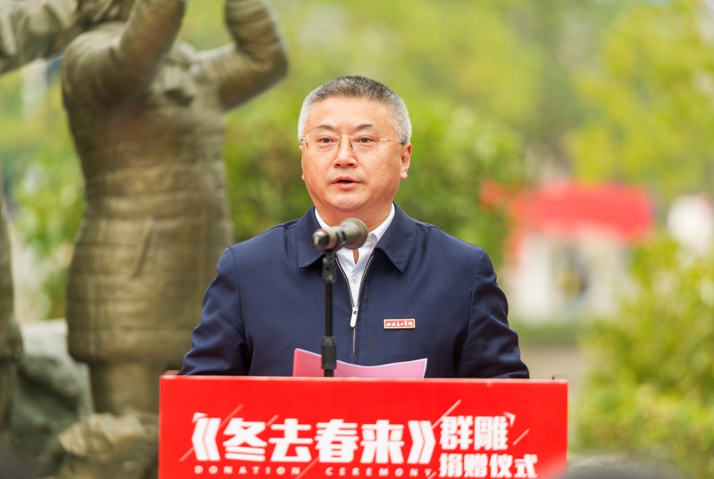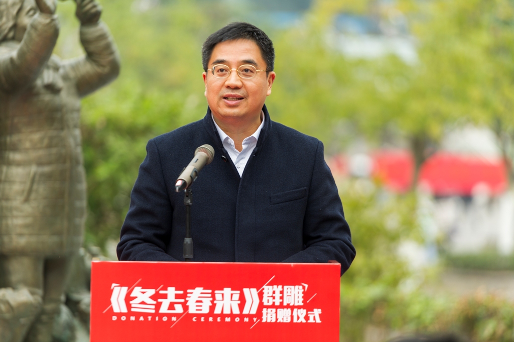 刘宴兵在致辞中衷心感谢我校创作团队为抗疫主题雕塑作品《冬去春来》所付出的心血,对我校的慷慨捐赠表示诚挚谢意。他指出,《冬去春来》落座重庆医科大学,为重医校园文化建设增添了浓墨重彩的一笔,成为医学生思想政治教育的重要载体和平台,为学校培养德才兼备的医学人才提供了鲜活生动的思政课素材。