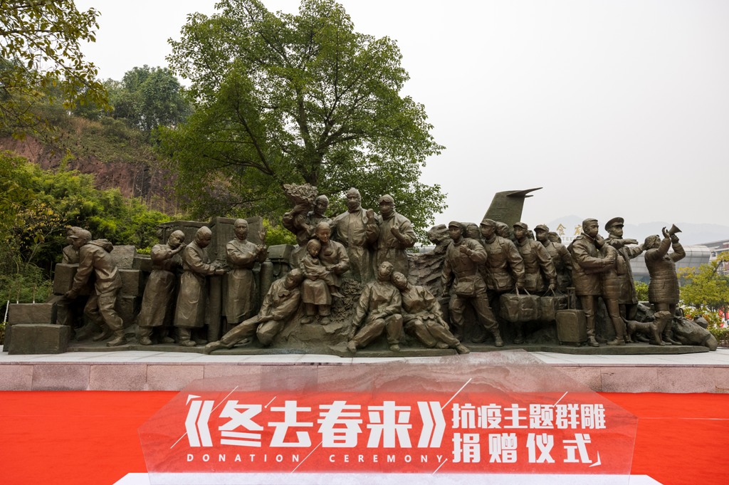 唐青阳表示,正值重庆医科大学65周年校庆之际,四川美术学院向重庆医科大学捐赠大型抗疫群雕《冬去春来》,以此向所有重庆医科大学老师、同学,向所有医护人员表示祝贺和敬意。