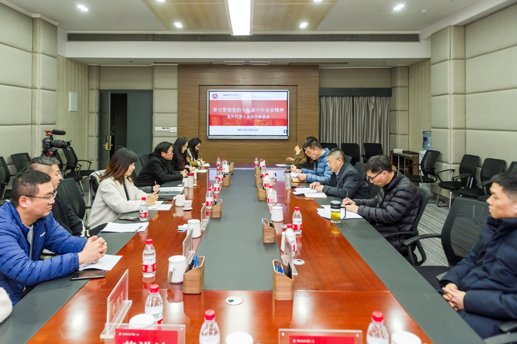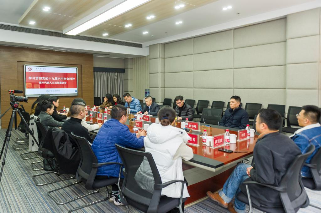 12月16日下午,以“学习贯彻党的十九届六中全会精神”为主题的党外代表人士双月座谈会在二会议室举行。市委宣讲团成员、学校党委书记唐青阳作党的十九届六中全会精神专题宣讲。来自民盟、民进、致公党、九三学社、知联会的党外代表人士参加了座谈会。党委统战部部长柏在华主持会议。
