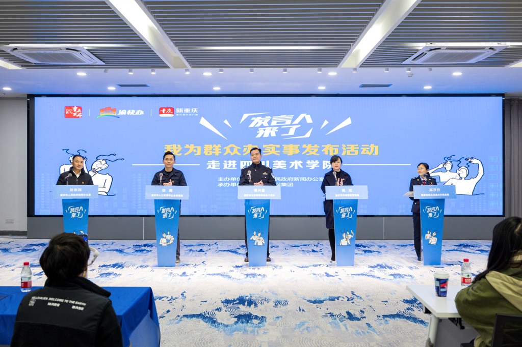 为推动大学生创新创业,进一步提高学生防范电信网络诈骗意识,12月28日下午,由市委宣传部(市政府新闻办)举办的“发言人来了——我为群众办实事”发布活动走进四川美术学院,开展相关信息发布、政策解读和现场答疑。我校党委宣传部、学生工作部组织40名学生代表,在虎溪校区五会议室参加了活动。活动由市政府新闻办新闻发布处处长徐祖国主持。