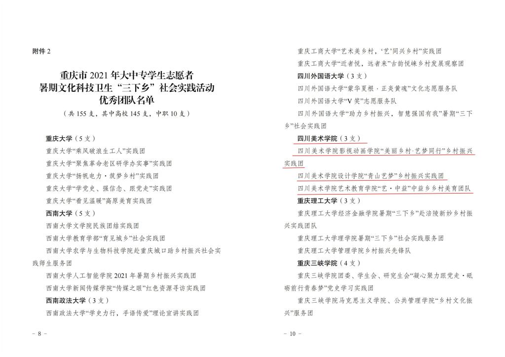 近日,在重庆市2021年暑期“三下乡”社会实践活动评比中,我校获得12项表彰。其中,学校团委获得“优秀单位”称号;影视动画学院“美丽乡村-艺梦同行”乡村振兴实践团、设计学院“青山艺梦”乡村振兴实践团、艺术教育学院“艺·中益”中益乡乡村美育团队共3支团队获得“优秀团队”称号;艺术人文学院团总支书记陈勃、建筑与环境艺术学院团总支书记蒋智丽获得“先进工作者”称号;田梓晗、马一凡、蓝星、颜慧、刘继斐、孙跃茹等6名同学获得了“优秀个人”称号。
