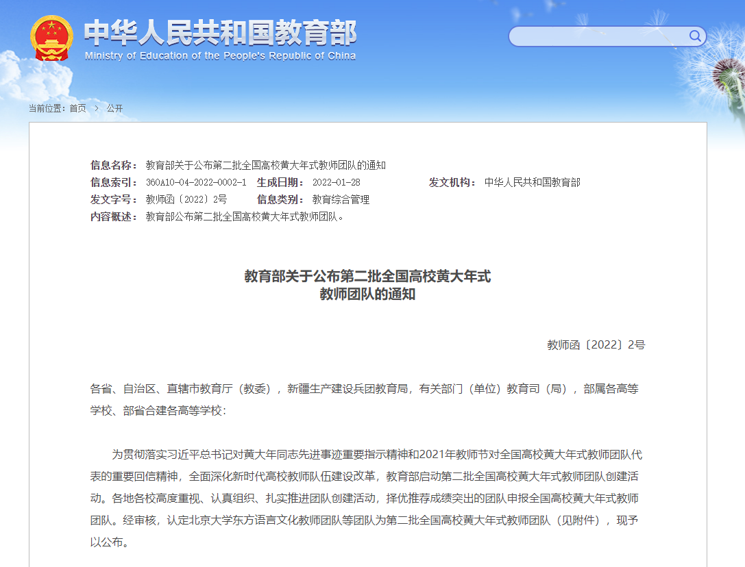 教育部为贯彻落实习近平总书记对黄大年同志先进事迹重要指示精神,启动了全国高校黄大年式教师团队创建活动,于2018年公布首批全国高校黄大年式教师团队。2021年教师节前夕,习近平总书记对全国高校黄大年式教师团队代表回信,肯定全国高校黄大年式教师团队的工作成绩,提出殷切期望。为贯彻习近平总书记对全国高校黄大年式教师团队代表的重要回信精神,教育部启动并认定第二批全国高校黄大年式教师团队创建活动,持续推进团队创建工作。