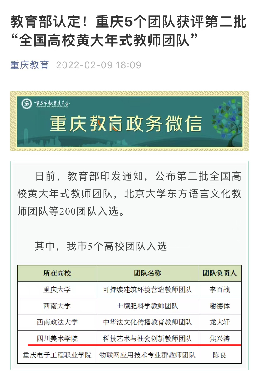 焦兴涛教授始终坚持工作在艺术教育的第一线,在其26年的教学生涯中,忠于职守,兢兢业业,为人师表,得到学校师生和全国同行的广泛认可和赞誉。2014年主导建立“跨媒介雕塑”工作室,开拓当代雕塑表现的新领域,成绩突出,2015年获批“重庆市新媒介美术创作重点实验室”。2021年,其领衔的“场景雕塑”课程及授课团队,同时入选国家级课程思政示范课程、课程思政教学名师和团队。2022年,作为入选的重庆市5个高校团队之一,焦兴涛领衔的“科技艺术与社会创新”团队成功入选第二批“全国高校黄大年式教师团队”。