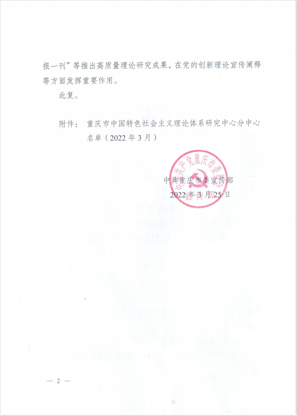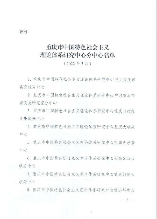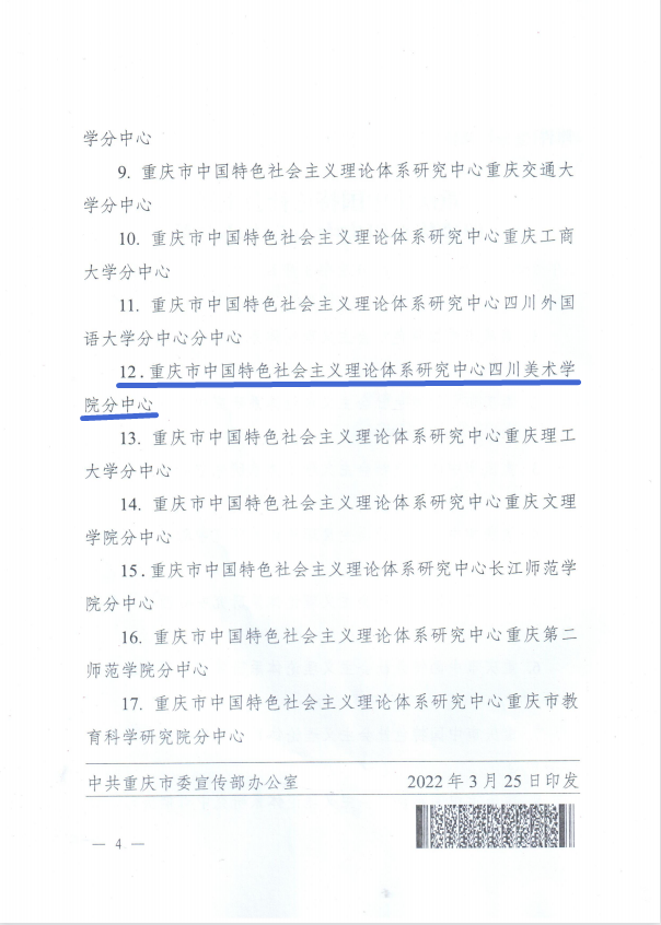 根据中共重庆市委宣传部2022年3月25日印发的《关于同意增设重庆市中国特色社会主义理论体系研究中心分中心的批复》(渝委宣[2022]34号),同意重庆市中国特色社会主义理论体系研究中心增设四川美术学院分中心。至此,我校经过不懈努力,正式成为重庆市中国特色社会主义理论体系研究中心在全市设立的17个分中心之一。