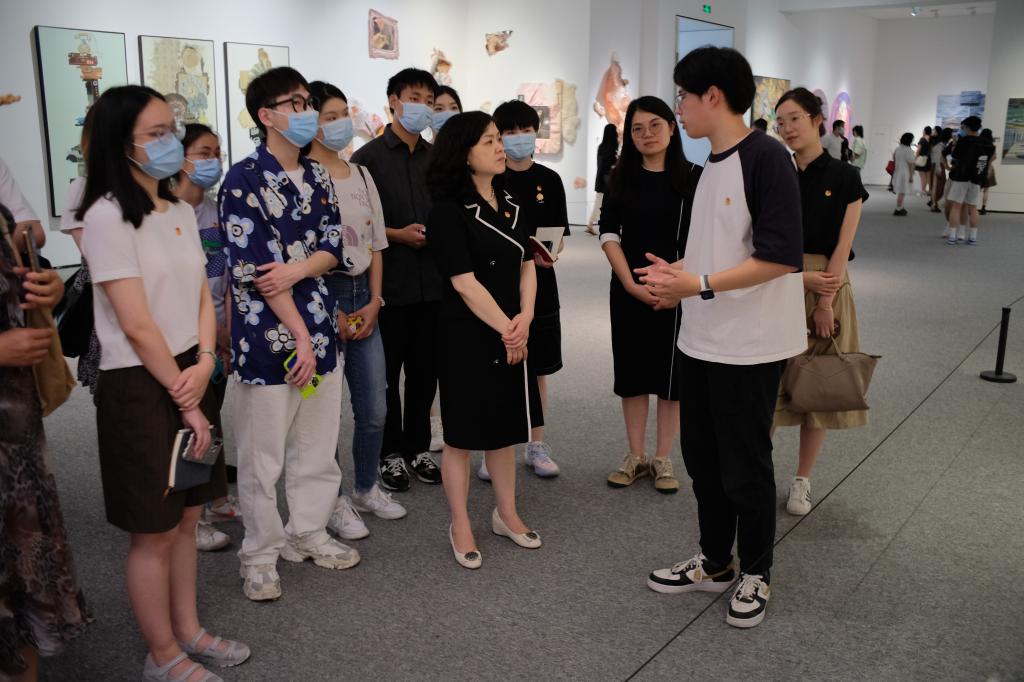 活动中,黄永宜与同学们一同走进“重庆艺术大市场-开放的六月——四川美术学院艺术游”2022毕业生作品展现场观展。她对现场作品进行了充分肯定,指出川美学子很好地践行了“思政+艺术”教学理念,通过自己的作品充分弘扬了优秀传统文化,传承了红色文化精神,表现了积极向上的精神面貌,展现了新时代共青团员的责任与但当。