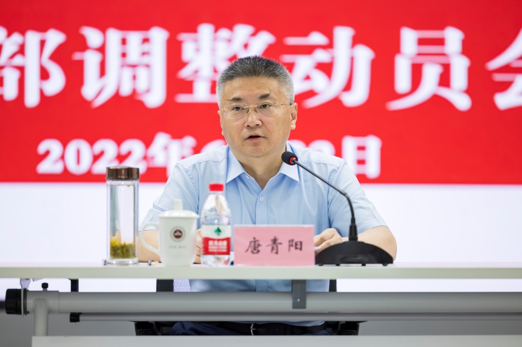 党委书记唐青阳作动员部署讲话。他指出,在全面推进落实“十四五”规划的重要背景下,本轮干部调整是学校党委立足新阶段、适应新形势,充分调研、通盘考虑、慎重研究后决定的重大部署。要求大家要充分认识干部调整工作的重要意义,这既是推动学校事业高质量发展的客观需要,也是加强学校干部队伍建设的现实需要。学校党委将把干部调整作为一项常态化工作来开展,成熟一部分调整一部分,进一步补充干部规模,优化干部结构,激发干部队伍的生机和活力。