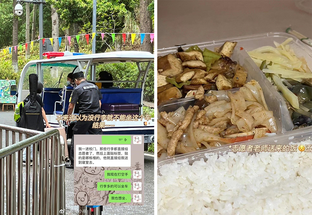 影视动画学院新生刘同学在微博上发图称赞学校志愿者服务细致又贴心:一进校,自己的行李就被贴上标签,由志愿者老师们送到相应的寝室去。还晒出了志愿者老师送上门的盒饭,配文“还不错”。